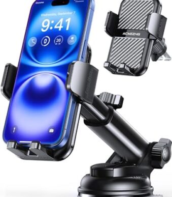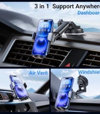 3-in-1 Car Phone Holder [122+LBS Strongest Suction & Stable Clamp Arm] 360° Adjustable Car Phone Mount, Cell Phone Holders for Your Car for Dashboard Vent, All Smartphones & Car Models (Black)