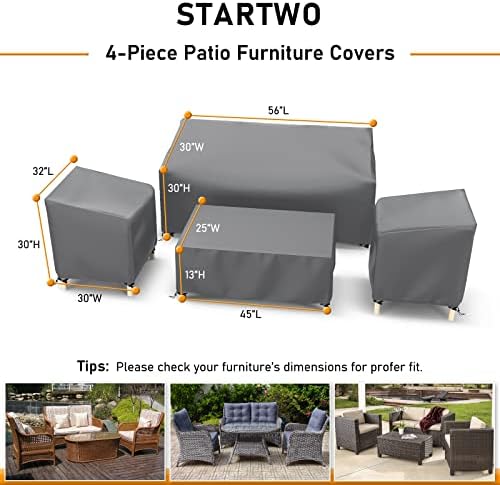 STARTWO Outdoor Waterproof Patio Furniture Covers 4-Piece Set for Chairs 32in, Loveseat 56in, Coffee Table 45in, Heavy Duty 600D, Grey